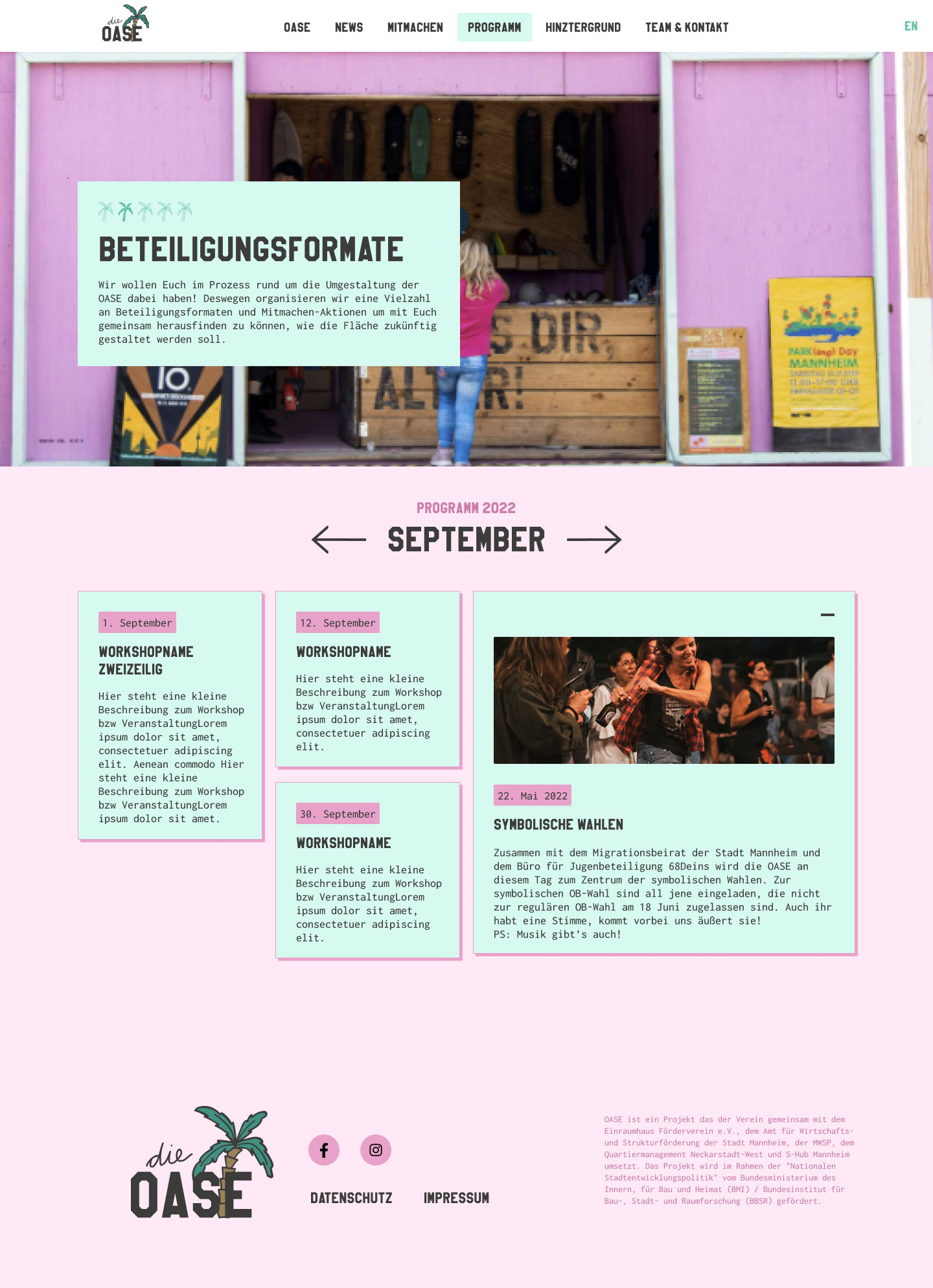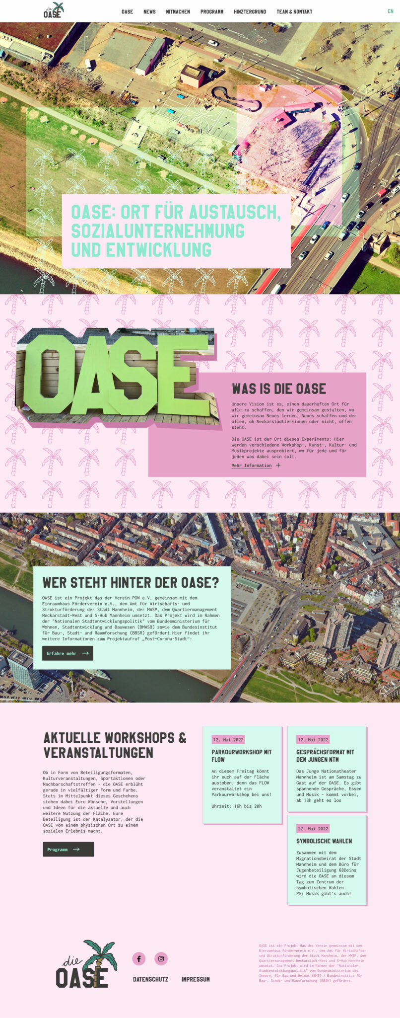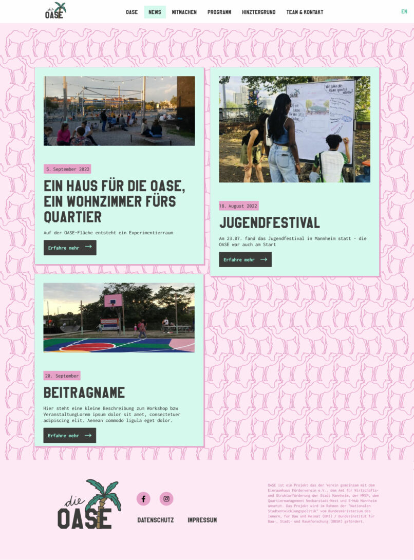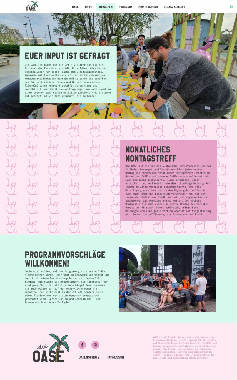 OASE steht für den Prozess auf der ehemaligen Biergartenfläche an der Kurpfalzbrücke einen bleibenden Ort zu schaffen, der niedrigschwellige Kultur-, Bildungs- und Freizeitangebote für alle Bewohner:innen des Quartiers anbietet und offen für alle ist. Auch die Webseite sollte dies wiederspiegeln.