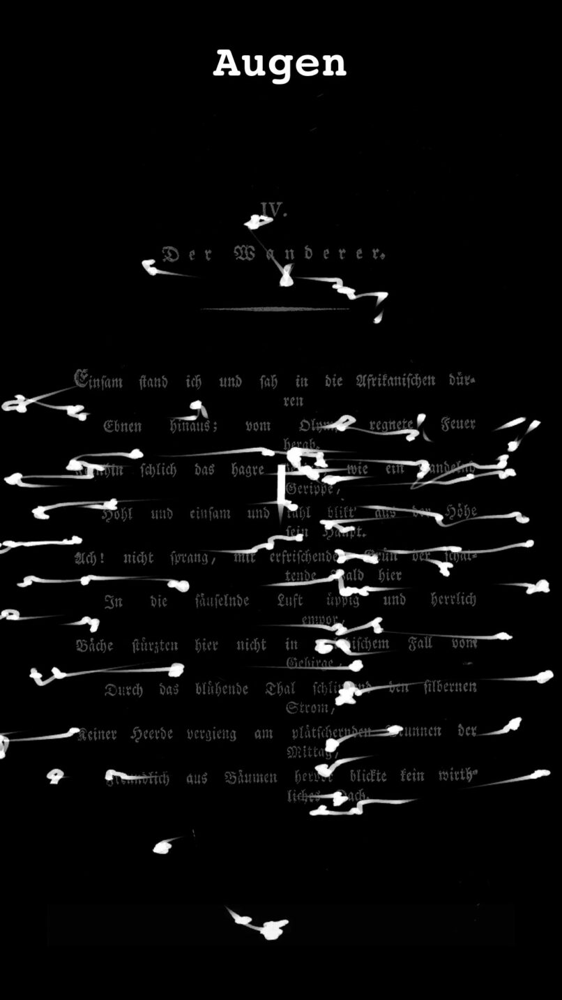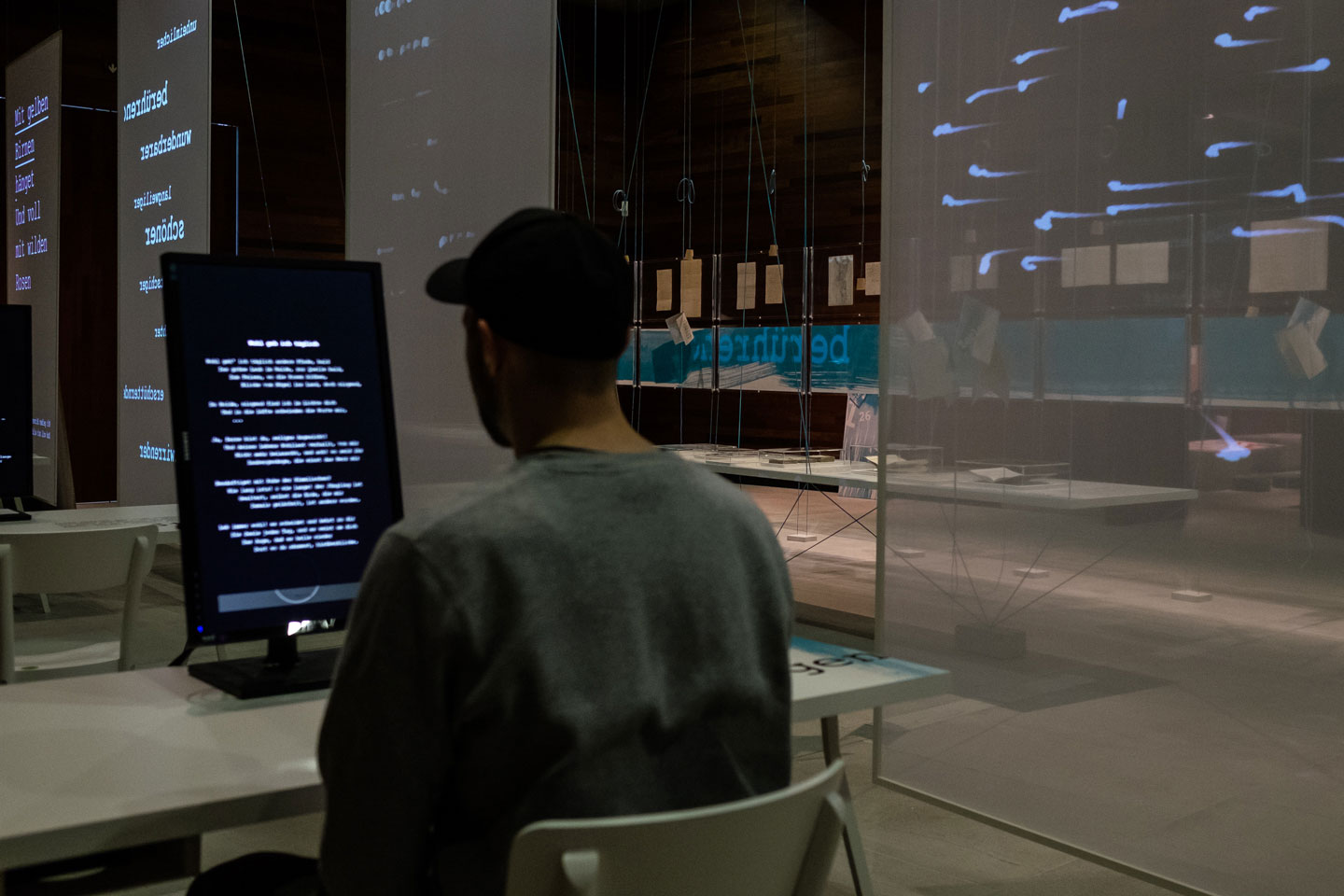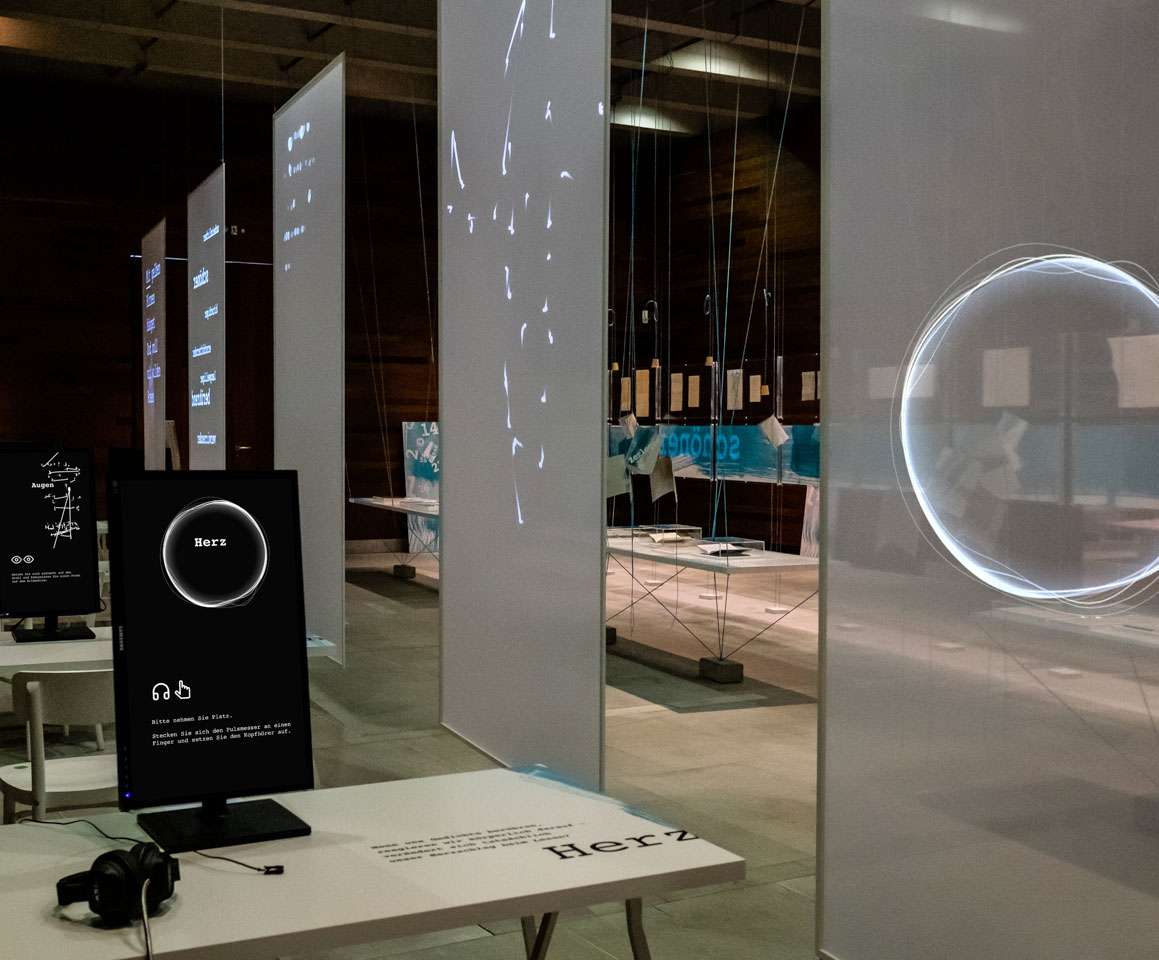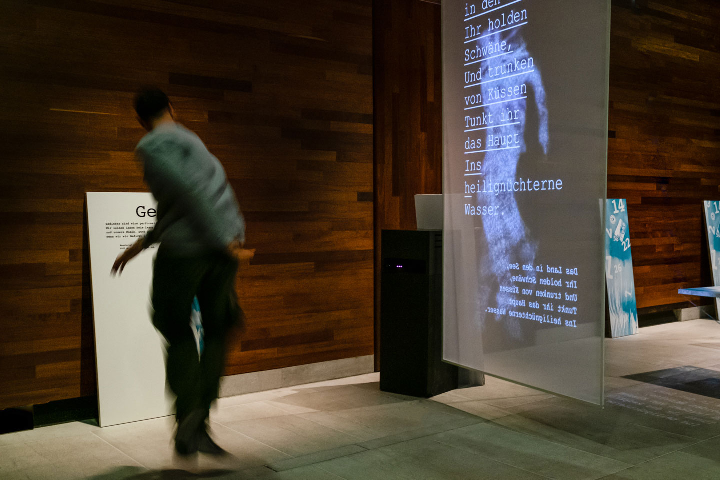 Wie fühlt sich ein Gedicht an? Wie hört es sich an? Was macht es mit mir wenn ich ein Gedicht vorlese oder versuche es darzustellen? Dies können Besucher in der Sonderausstellung „Hölderlin, Celan und die Sprachen der Poesie“ im Literaturmuseum der Moderne herausfinden. An fünf interaktiven Exponaten können die Besucher in die Welt der Gedichte eintauchen. Ihr Input wird dabei gemessen (Eye-Tracking, Pulsmessung, Gesten- und Spracherkennung) und in live generierte Grafiken übersetzt, die für die anderen Besucher sichtbar, auf Leinwände projiziert werden.